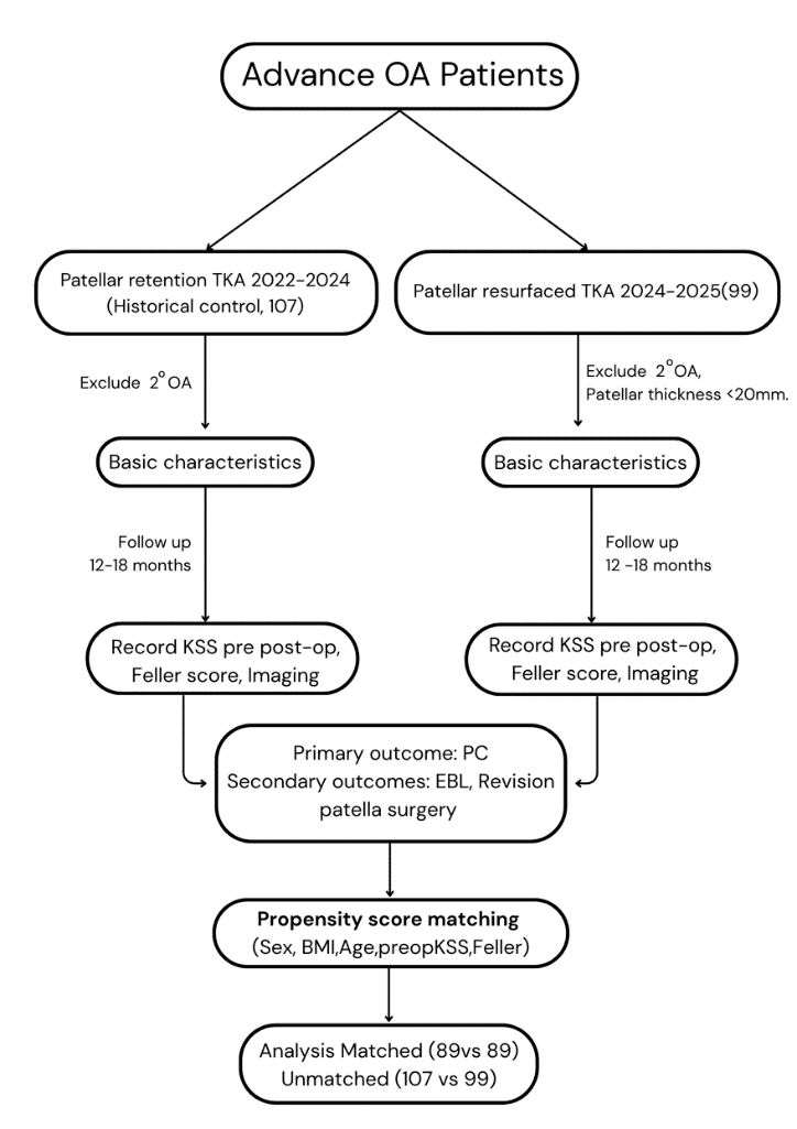 Methods: This retrospective comparative study included patients aged 55–80 years with Kellgren–Lawrence grades 3–4 knee osteoarthritis who underwent PS-TKA. The patients were divided into resurfaced and non-resurfaced groups. Propensity score matching using sex, body mass index, age, preoperative Knee Society Score, and preoperative Feller score produced 89 matched patients per group. The primary outcome was the presence of patellar crepitus. Secondary outcomes included blood loss, radiographic patellar alignment, functional scores, and complications.